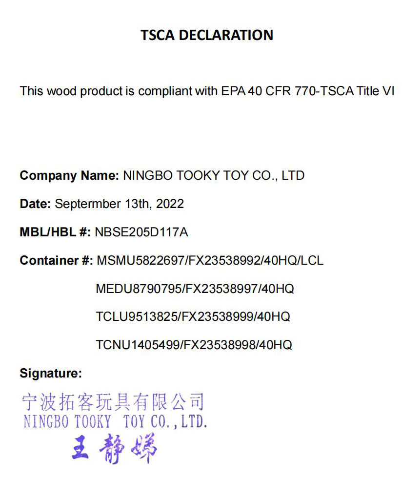 - TSCA (Toxic Substances Control Act) is a necessary document for import to the United States, remember to ask the supplier to provide along with the invoice, packing list and copy Bill.